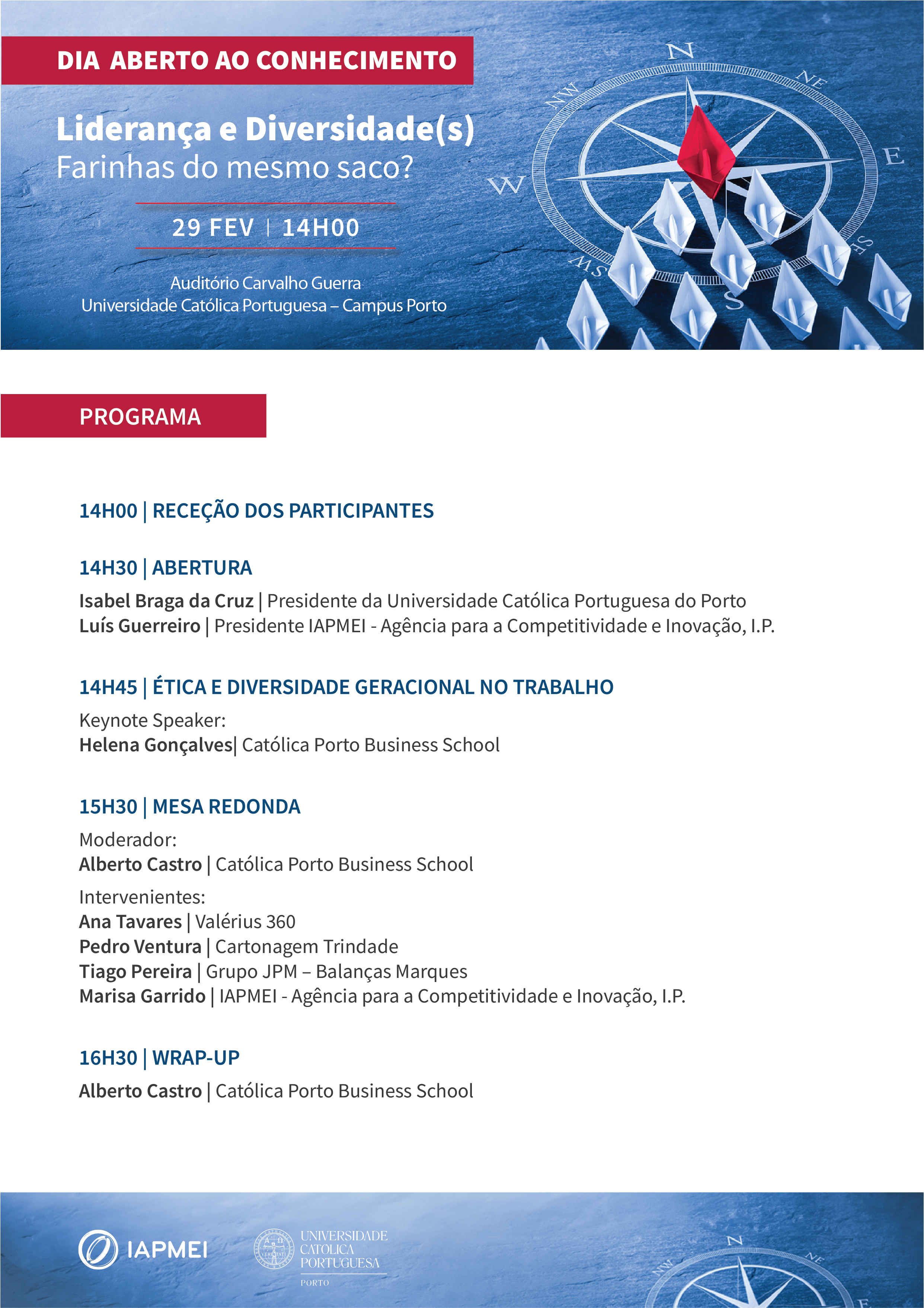 Realiza-se no dia 29 de fevereiro um Dia Aberto ao Conhecimento, subordinado ao tema “Liderança e Diversidade(s) - Farinhas do mesmo saco”, dinamizado pelo IAPMEI e pela Universidade Católica Portuguesa - Porto.