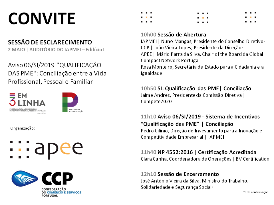 Realiza-se no dia 2 de maio, nas instalações do IAPMEI em Lisboa, uma sessão de esclarecimento sobre o novo concurso a incentivos à conciliação entre a vida profissional, pessoal e familiar, numa organização da Associação Portuguesa de Ética Empresarial (APEE) e da Confederação do Comércio e Serviços de Portugal (CCP).