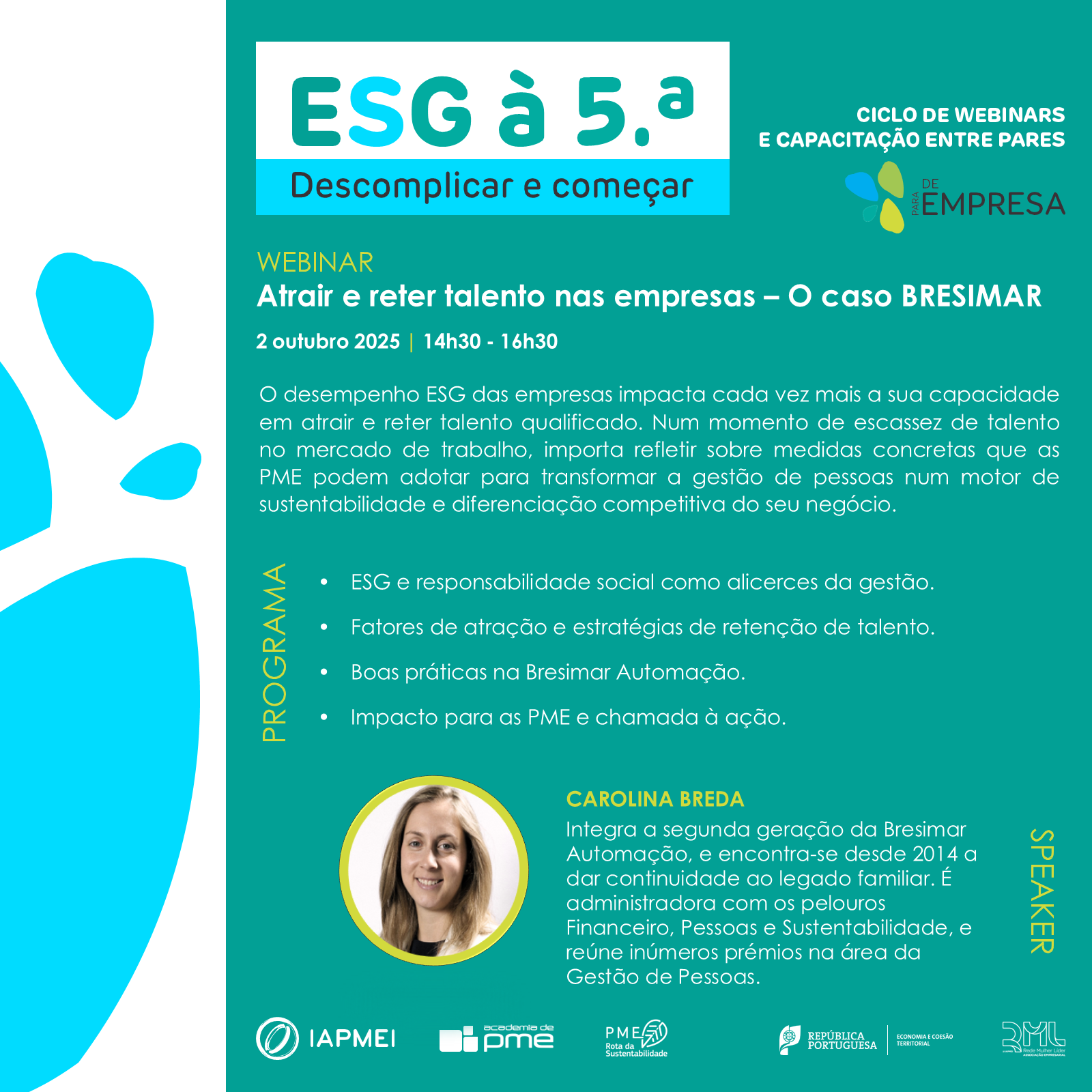 O próximo webinar do ciclo ESG à 5.ª do IAPMEI é já no dia 2 de outubro, e tem como convidada especial a empresa Bresimar Automação.