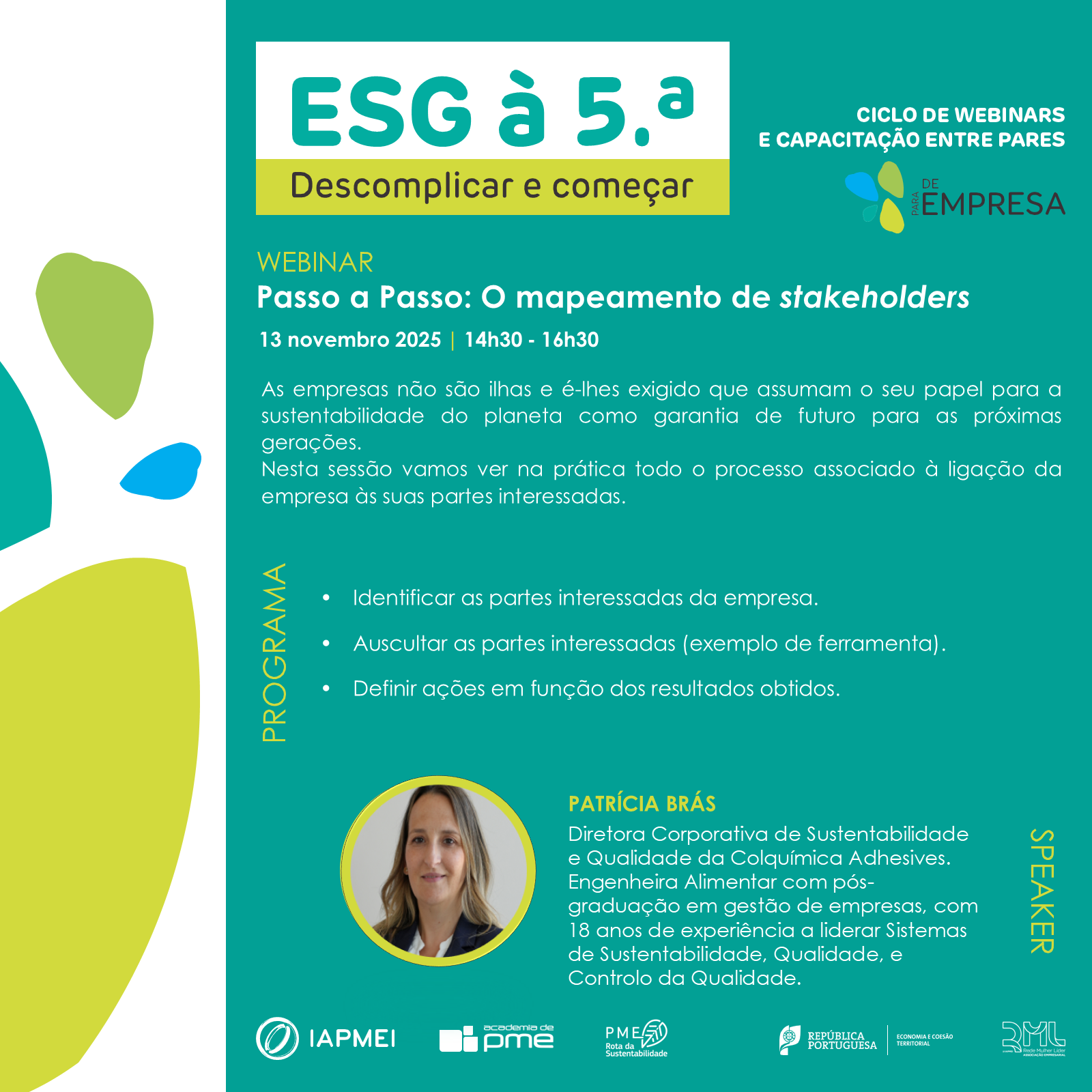 O ciclo de webinars ‘ESG à 5.ª’ vai ajudar, todas as quintas-feiras, empresários e as suas equipas a descomplicar conceitos ligados aos pilares E (ambiental), S (social), e G (governance) da gestão sustentável, e a aprender com a experiência de quem está mais avançado no seu percurso de transição para a sustentabilidade.