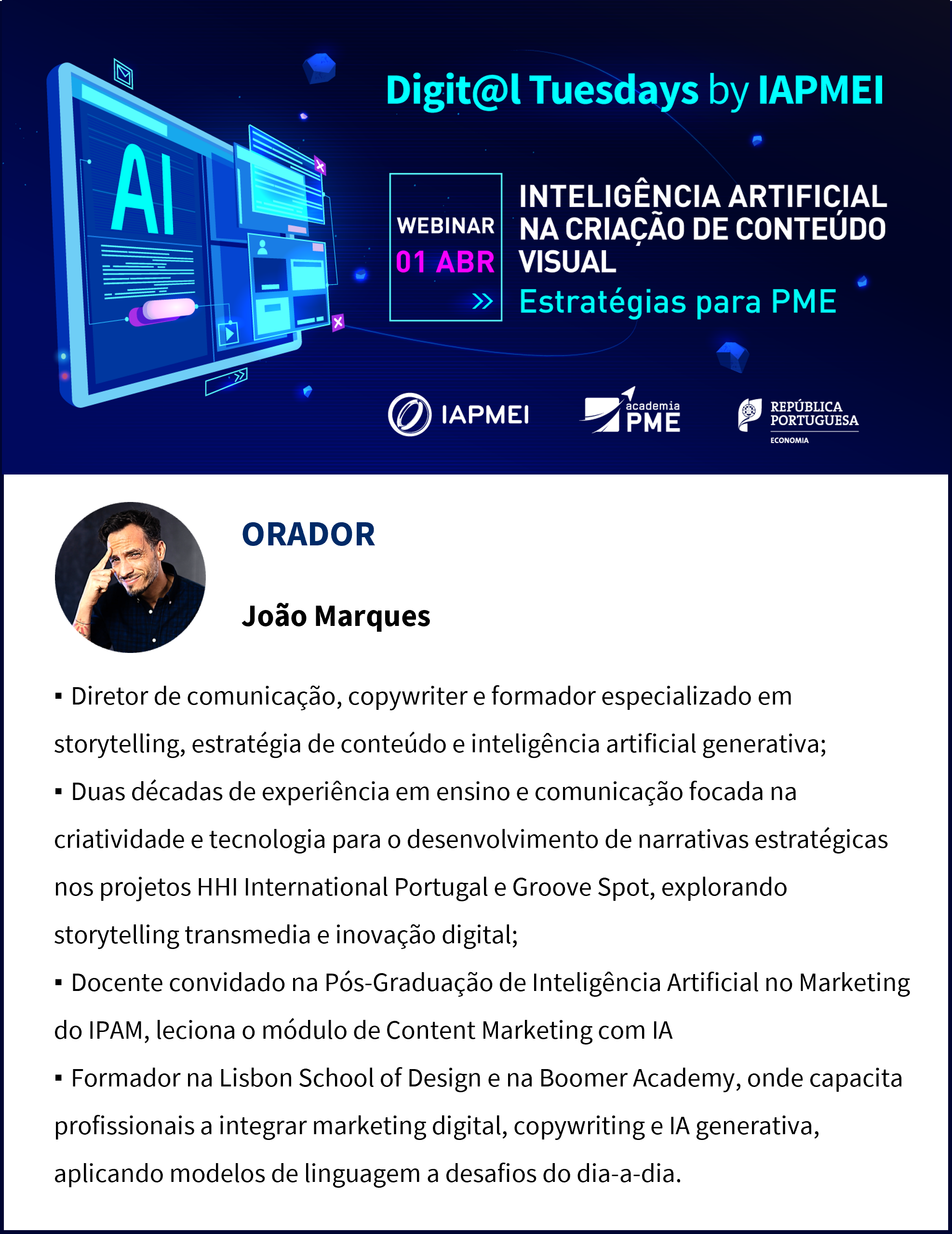 Durante a sessão, que tem como orador João Marques, será explorado o impacto da Inteligência Artificial generativa na produção de conteúdos visuais para marketing digital e redes sociais.