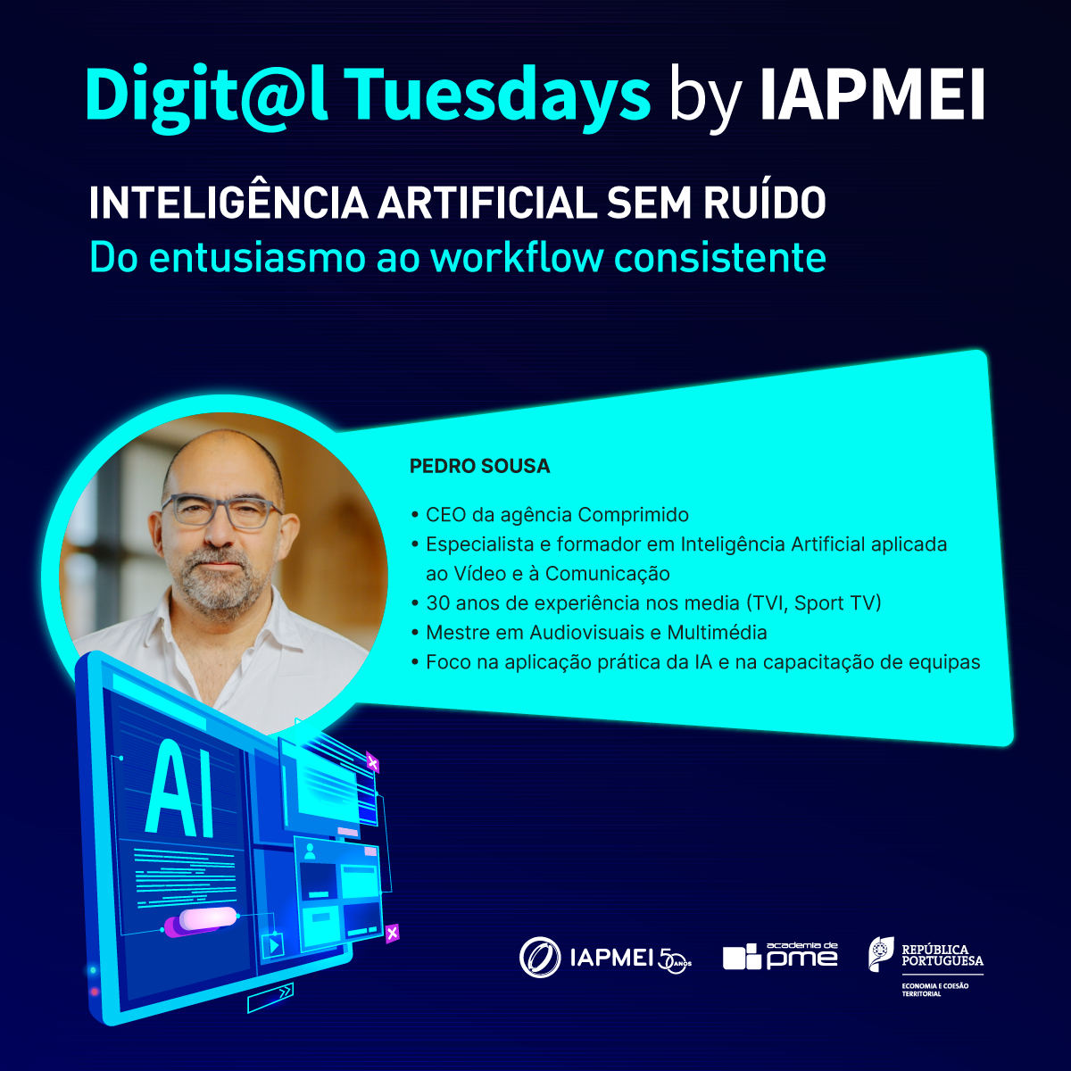 Realiza-se no dia 10 de março mais um webinar integrado na iniciativa da Academia de PME do IAPMEI, Digit@l Tuesdays, desta vez com o tema "Inteligência Artificial sem ruído: do entusiasmo ao workflow consistente".