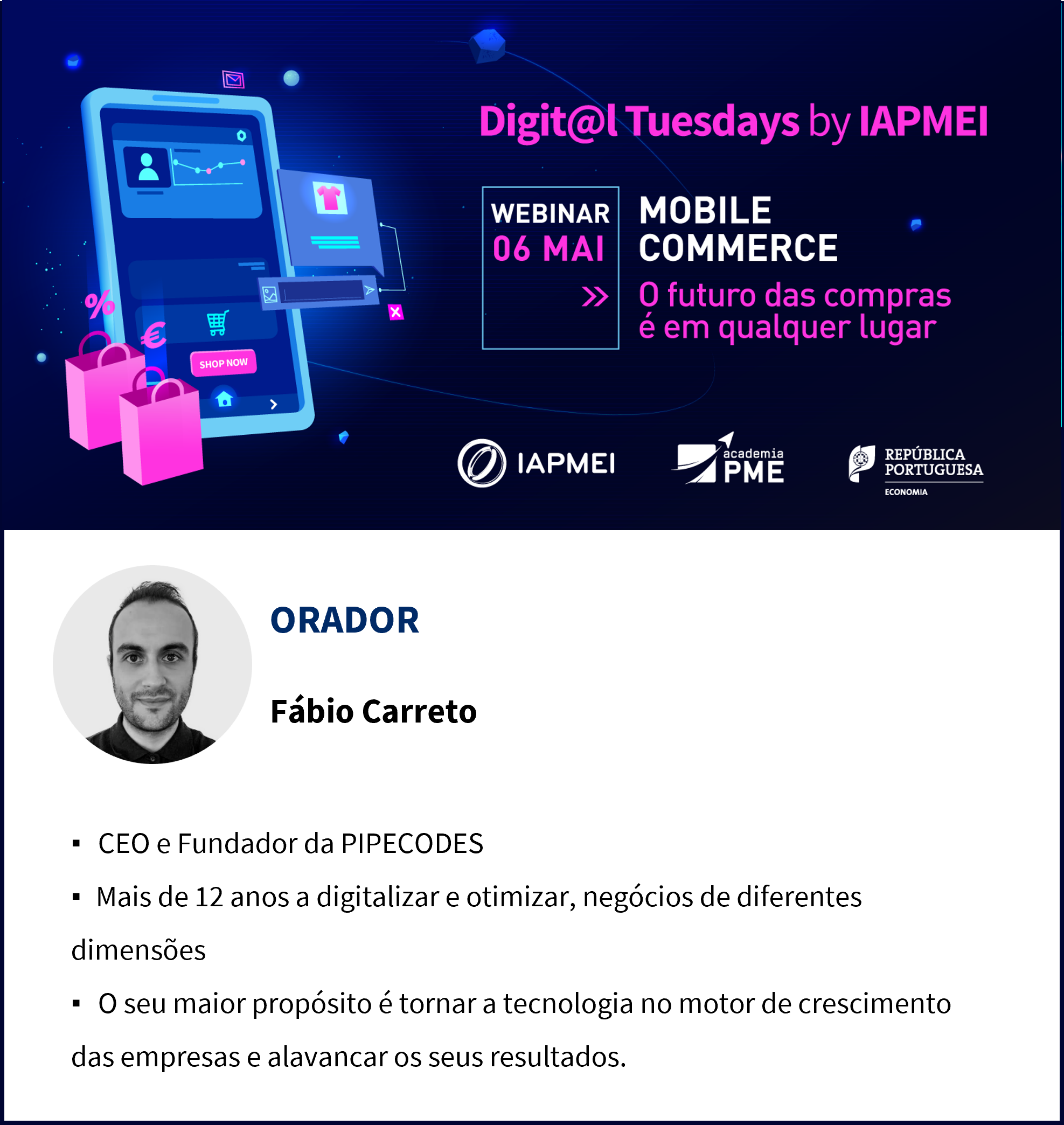 Realiza-se no dia 6 de maio mais um webinar integrado na iniciativa da Academia de PME do IAPMEI, Digit@l Tuesdays, desta vez sobre "Mobile Commerce: o futuro das compras é em qualquer lugar".