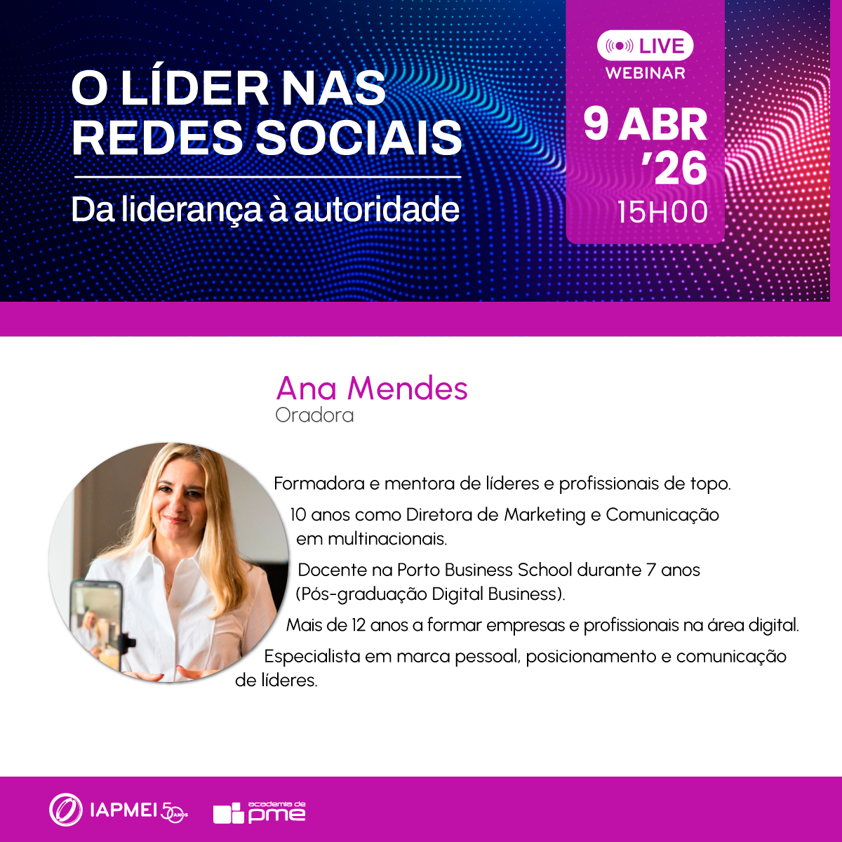 Realiza-se no dia 9 de abril o webinar "O Líder nas Redes Sociais: da liderança à autoridade", organizado pela Academia de PME do IAPMEI.