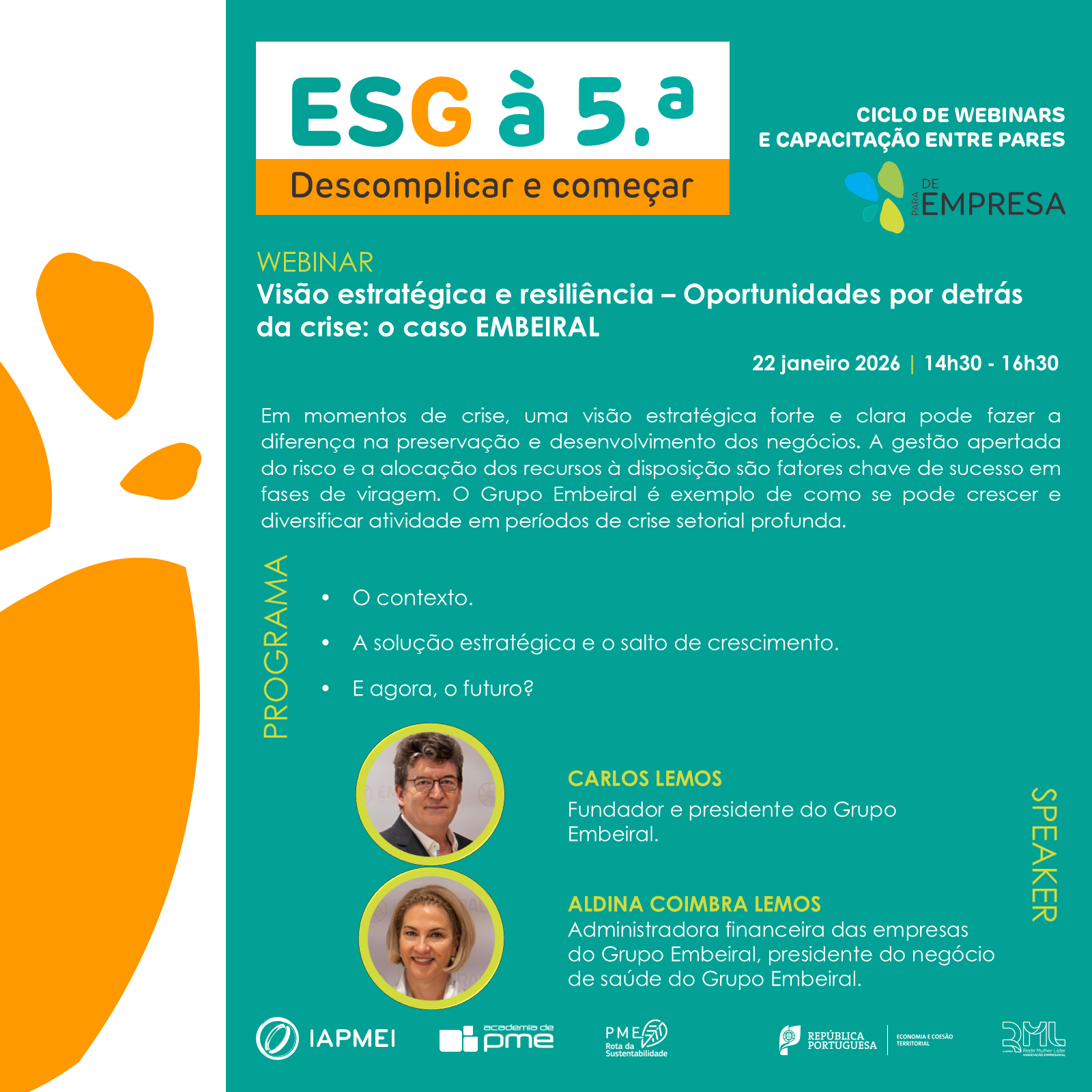 A participação no webinar ‘Visão estratégica e resiliência – Oportunidades por detrás da crise: O caso EMBEIRAL’ é gratuita, mas sujeita a inscrição.